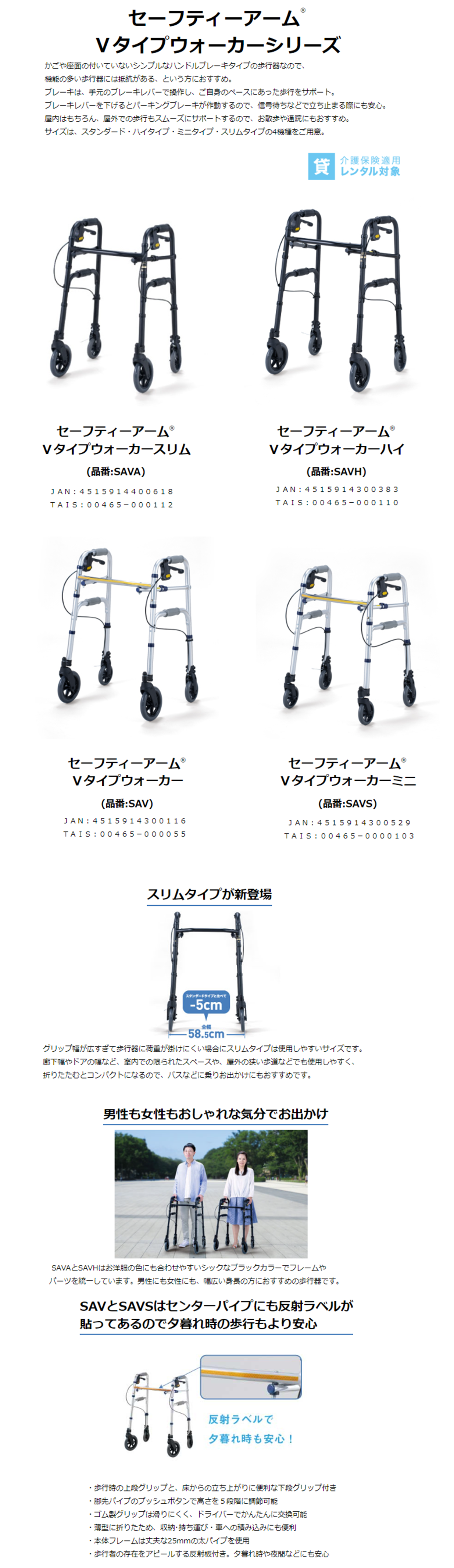 | ハンドルブレーキ付きの歩行車。4輪キャスターでスムーズな歩行をサポート。屋外・室内用タイプ。 | ||||||||||||||||||||