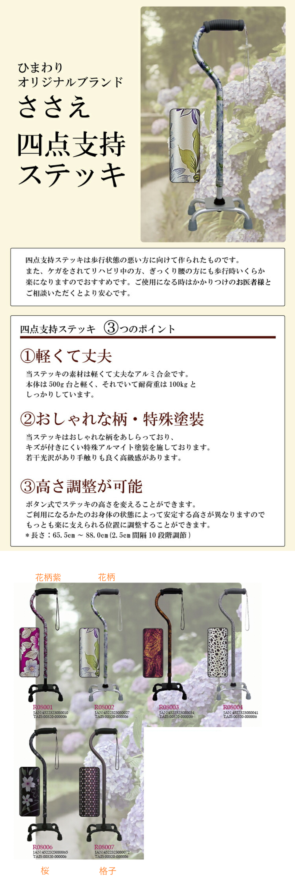 | ・長さ:65.5~88cm ・重量:565g ・材質: (支柱・脚):アルミニウム合金 (グリップ):ゴム系樹脂(TPR) ・型番: 花柄:R08002 花柄紫:R08001 桜:R08006 黒:R08005 格子:R08007 |